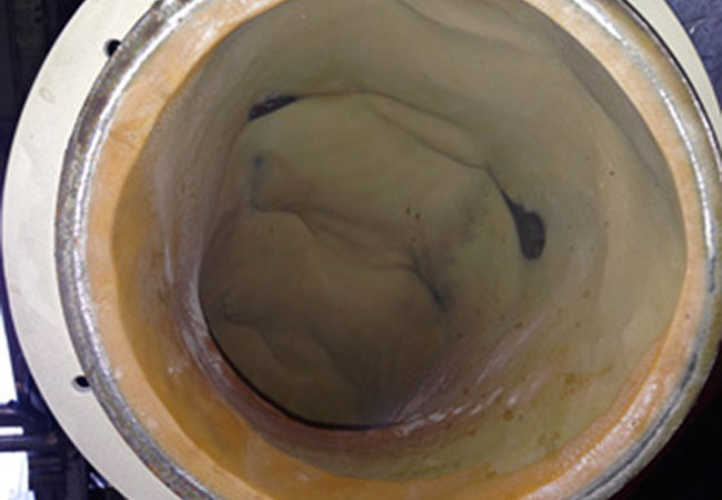 Egy fűrész elszívórendszerének hibás csőkanyarulata – amelyet az agresszív por nagyon gyorsan ledarált, vagy a speciálisan felhordott védőbevonat megsérült.