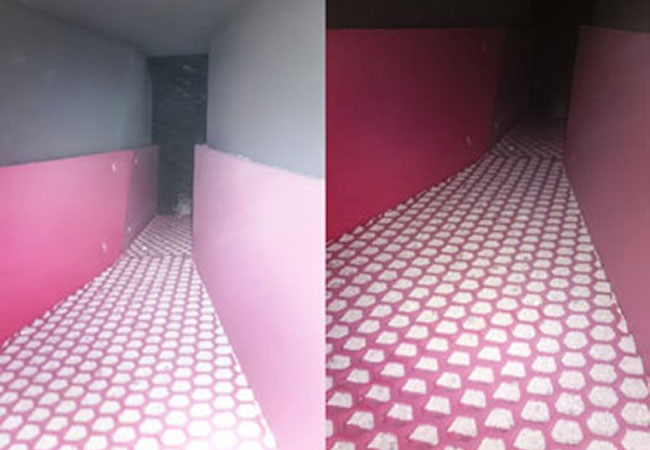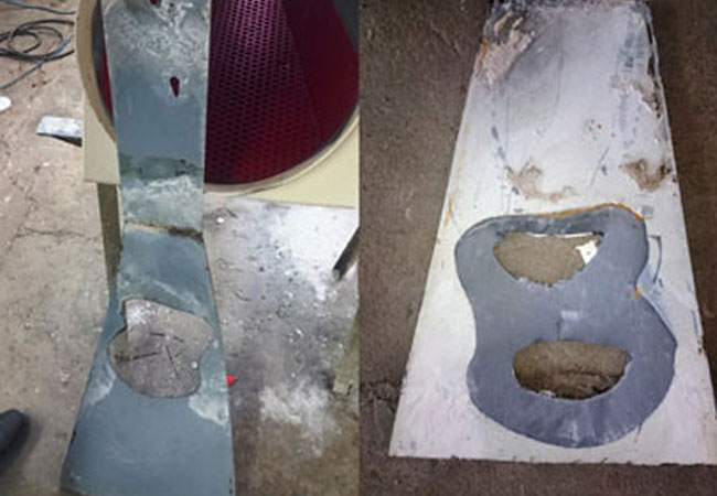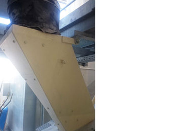 A szilíciumos homok fluidágyas szárítóban 0,4 mm – 8,0 mm szemcseméretű vegyes homokfrakciókat szárítunk. Az éles szélű szemcseszerkezet miatt az anyaggal érintkező valamennyi alkatrész rendkívül nagymértékben kopik. A szárítóból a kiürítő szállítószalagra vezető kivezető csúszdában a szárított homokot szintén kb. 80°C-os hőmérsékletű terhelés éri.